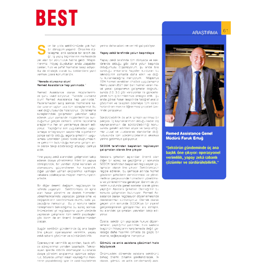 Remed Assistance'deki gelişmeler Best Dergisi Ocak Sayısı insert ekini okumak için tıklayın.